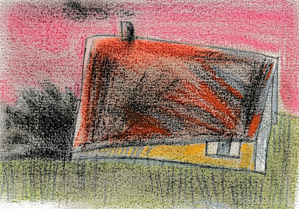 Il y a du grain dans le dessin. Cette petite bâtisse, isolée dans la campagne, était franchement de guingois, avec une avancée de toiture qui s’inclinait dangereusement, ce qui ne semblait pas inquiéter ses habitants.