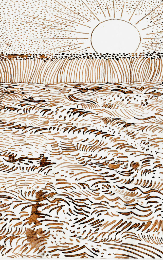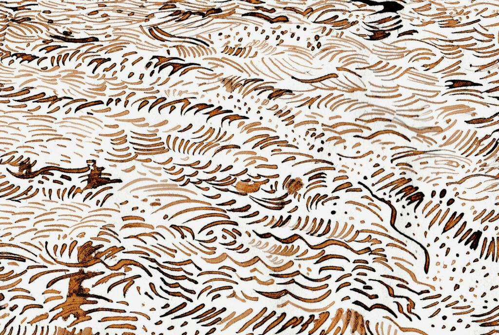 Cet iris schématisé évoque modestement ceux qu’a peint Van Gogh quand il a séjourné à l’asile St-Paul de St Rémy-de-Provence, où il avait volontairement été hospitalisé. Il s’agissait alors pour Vincent de retrouver une certaine sérénité psychologique dans l’observation de la nature. On peut y voir une analogie dans le choix du même sujet, avec les estampes réalisées à la fin des années 1820 par Hokusai, dont il connaissait l’œuvre. En effet, lui et son frère rassemblèrent une très importante collection d’estampes japonaises que Vincent présenta au printemps 1887, lors de son exposition qui fut organisée au café du Tambourin à Montmartre.
