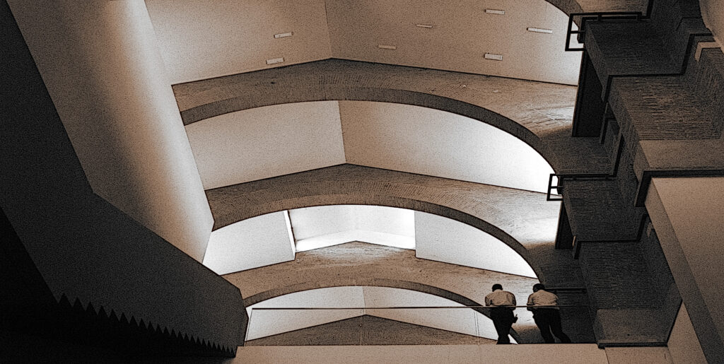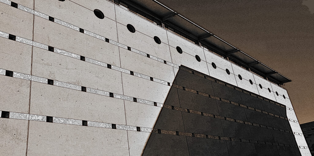 Avec un peu d’imagination, l’ombre portée sur la façade de ce bâtiment, conçu par un célèbre architecte de la fin du XXème siècle, forme un « A », dans une police de caractères futuristes. Ce qui ne trahit pas la volonté de l’illustre maître-d’œuvre, dont pour quelques rares initiés de la chose architecturale, nous indiquerons le nom : Paul Chemetov (1928-2024).