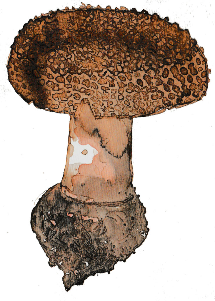 Amanite rougissante ou Amanite vineuse – Amanita rubescens. Espèce très commune poussant aussi bien sous les feuillus que sous les conifères. Elle est caractérisée par sa chair rougissante dans les blessures. Une fois cuite,c’est un comestible réputé. Mais elle est toxique crue.