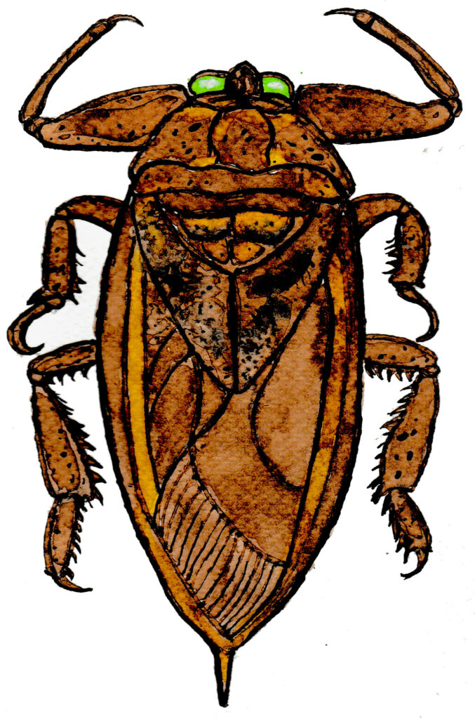 Léthocère d’Amérique – Lethocerus americanus ou Lethocerus grandes. Cette punaise d’eau géante a une taille de 8 à 10 cm. Très répandue, elle se rencontre dans le mares, lacs et marais des USA et du sud du Canada. Prédatrice, elle se nourrit d’amphibiens, de poissons, d’insectes, de crustacés, d’escargots et même de reptiles plus gros qu’elle, au moyen de ses pattes avant très robustes et de sa salive toxique. En principe, elle n’attaque pas l’homme si elle n’est pas dérangée, mais sa piqure est très douloureuse. Donc si vous voulez impressionner votre belle en jouant Tarzan dans un plan d’eau d’Amérique du Nord et que vous y rencontrez la bestiole, décampez en vitesse ! Le plan séduction sera pour une autre fois.
