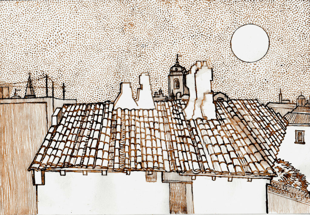 Cette vue des toits d’Arles a été prise depuis l’hôtel-restaurant Carrel, où Van Gogh a résidé pendant dix semaines. En direction du sud-ouest, on aperçoit depuis la gauche, les arènes, la flèche de l’église des Cordeliers, la tour St-Julien et tout à droite près du Rhône, l’église des Dominicains. Vincent a aussi peint deux vues assez similaires de l’intérieur du restaurant. Ces deux tableaux se trouvent dans des collections privées.